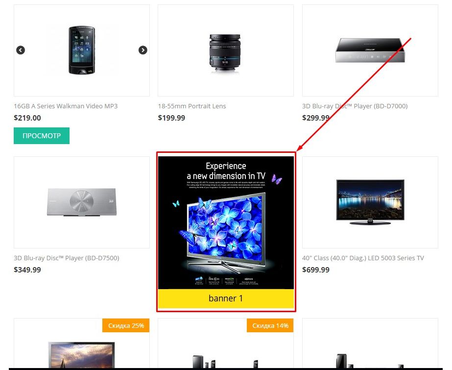 Модуль создает свою гибкую подсистему управления баннерами, которые размещаются в товарных списках среди товарных предложений, занимая указанную в настройках "плитку" товара.