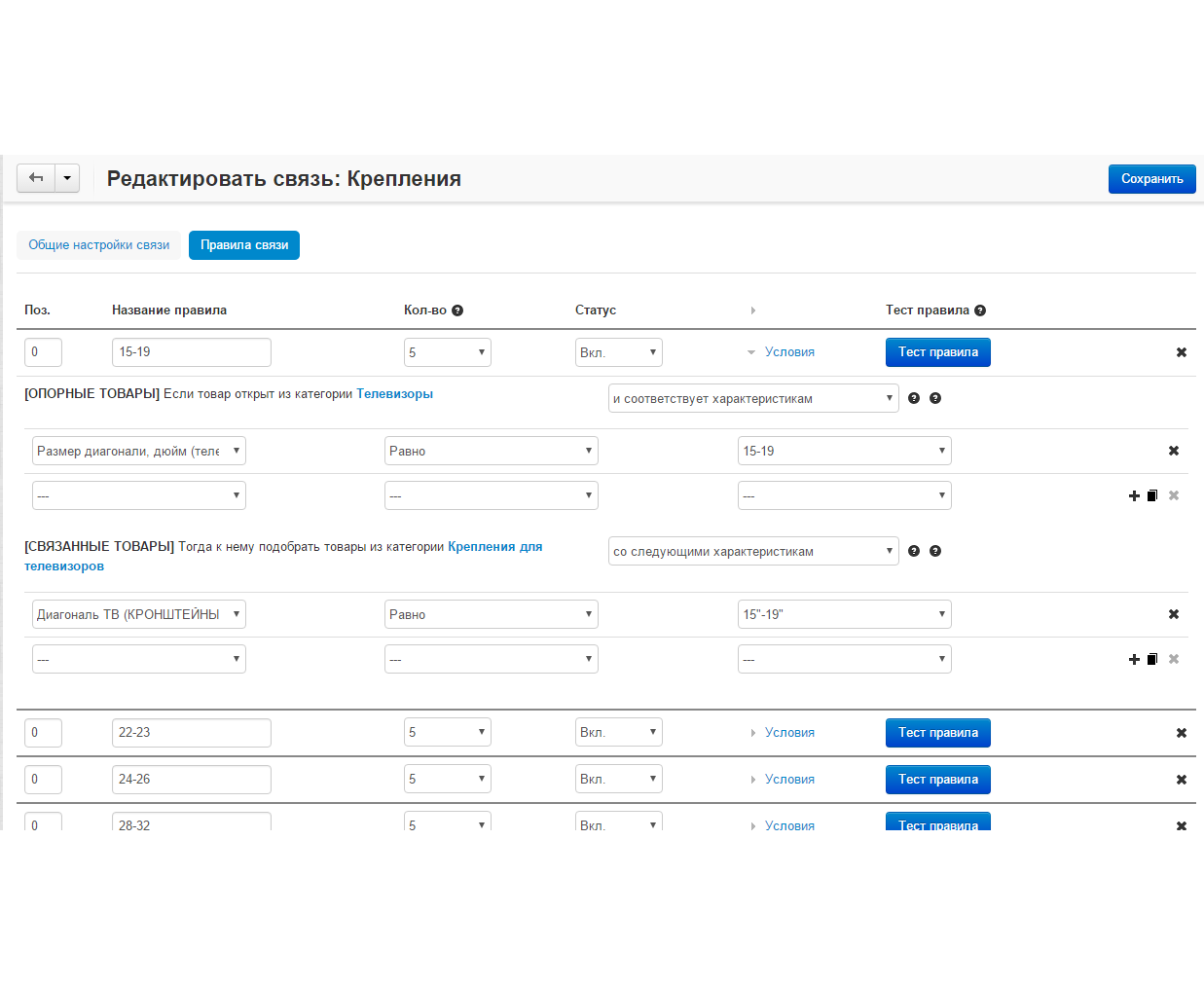 - Настройка генерации связей и подбора товаров - аксессуаров или аналогов на основе характеристик не занимает много времени (за несколько минут делается полная настройка связей для большой категории товаров, которая будет учитывать все возможные комбинации связей в правилах подбора аналогов или аксессуаров)