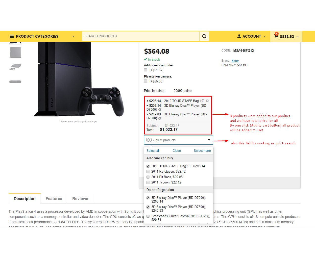 Модуль призван увеличить чеки за счет размещения подборки товаров в непосредственной близости к кнопке "Купить" и удобного интерфейса добавления товаров к заказу. Ранее для этой функции часто использовался функционал Опции товара, но это неудобно, так как тяжело вести ценовую и учетную работу по таким предложениям.