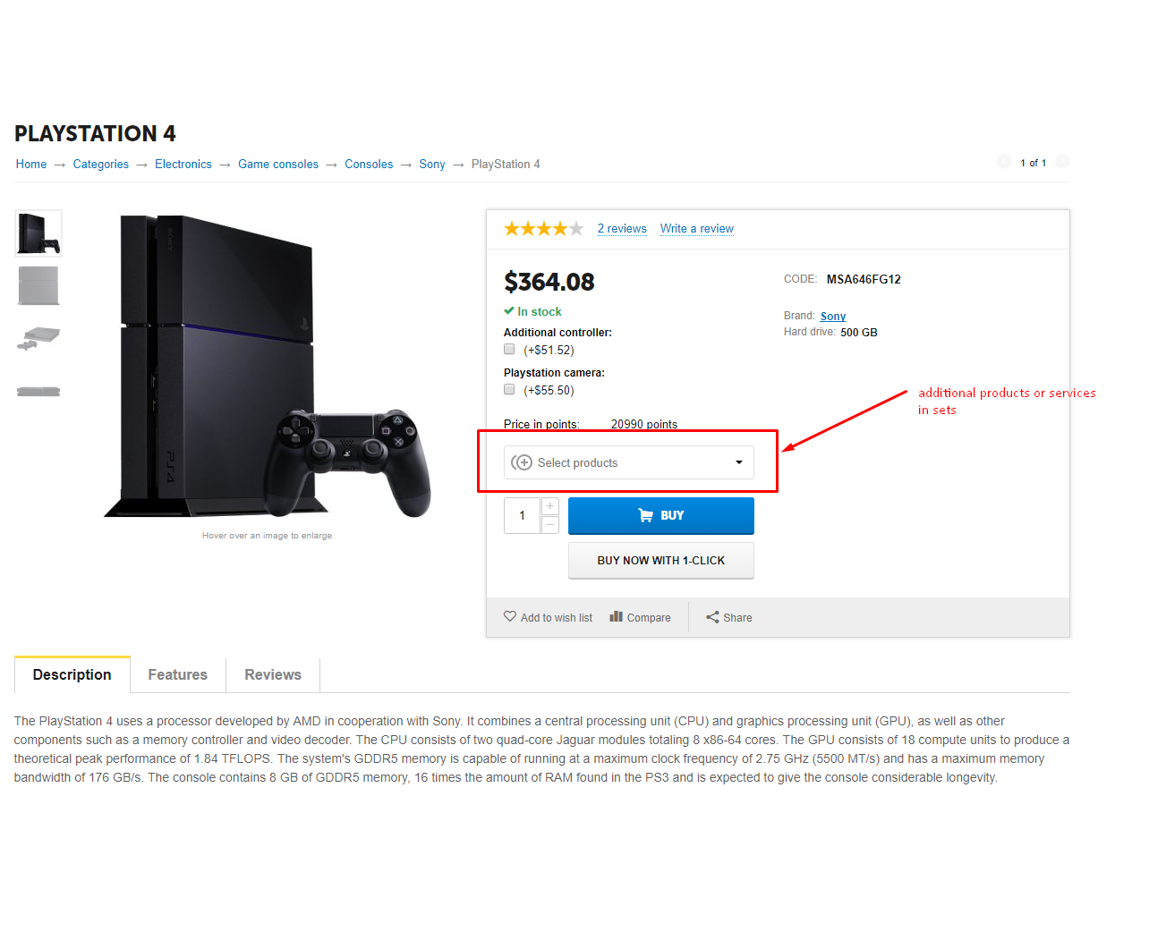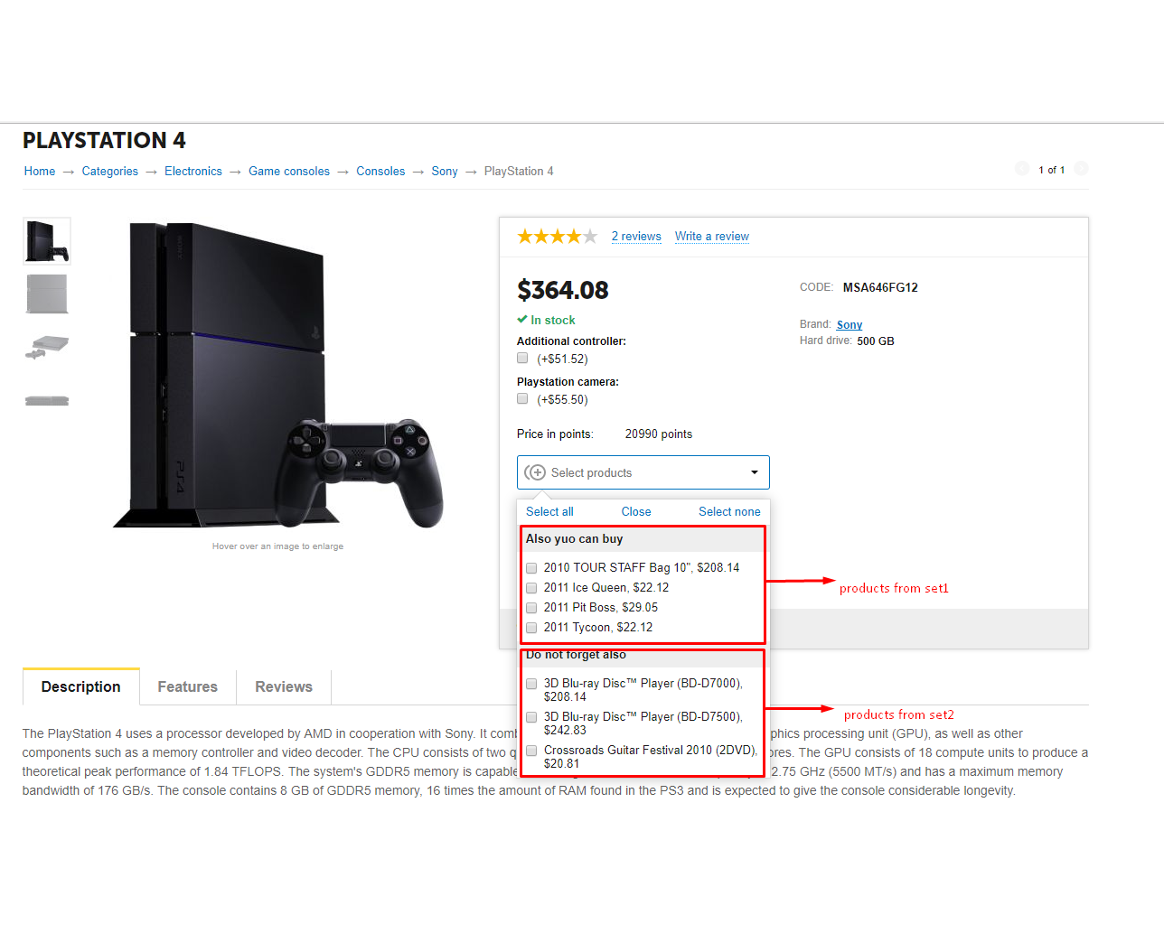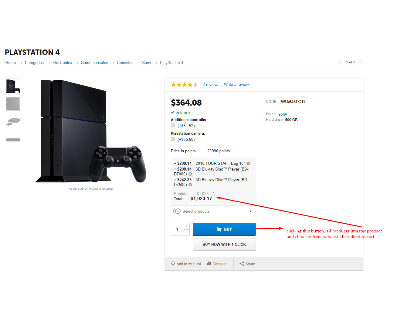 - Получаем в карточке товара поле с интерфейсом добавления товаров из комплектов с возможностью отметить необходимые (в момент добавления система подсчитает общую сумму покупки с учетом скидок, если они есть) по клику на кнопку Купить в корзину будет отправлен товар с выбранными товарами из предложенного списка.