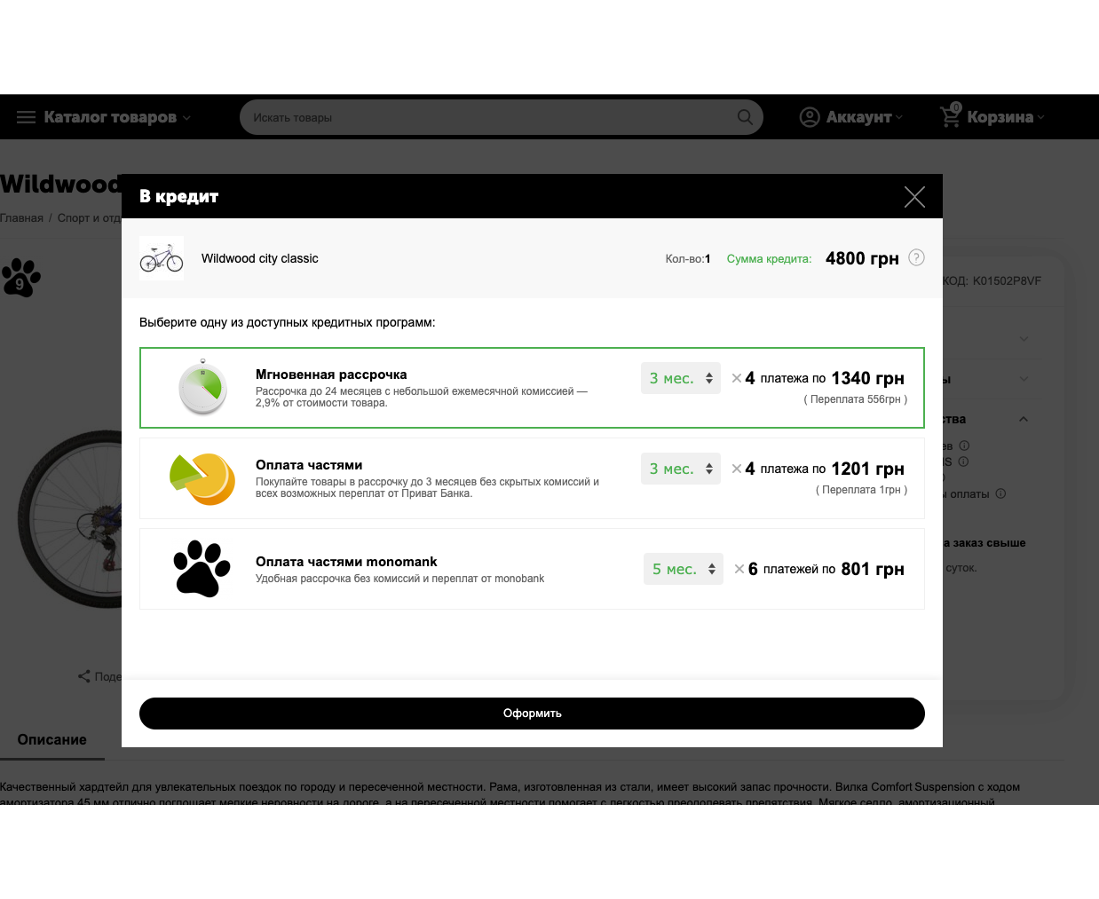 Модуль обеспечивает совместную работу кредитных программ и рассрочек разных способов оплаты для Украины, предлагая единую кнопку Купить в кредит на странице товара и удобный интерфейс, в котором пользователь может подобрать подходящий план рассрочки из разных способов оплаты.