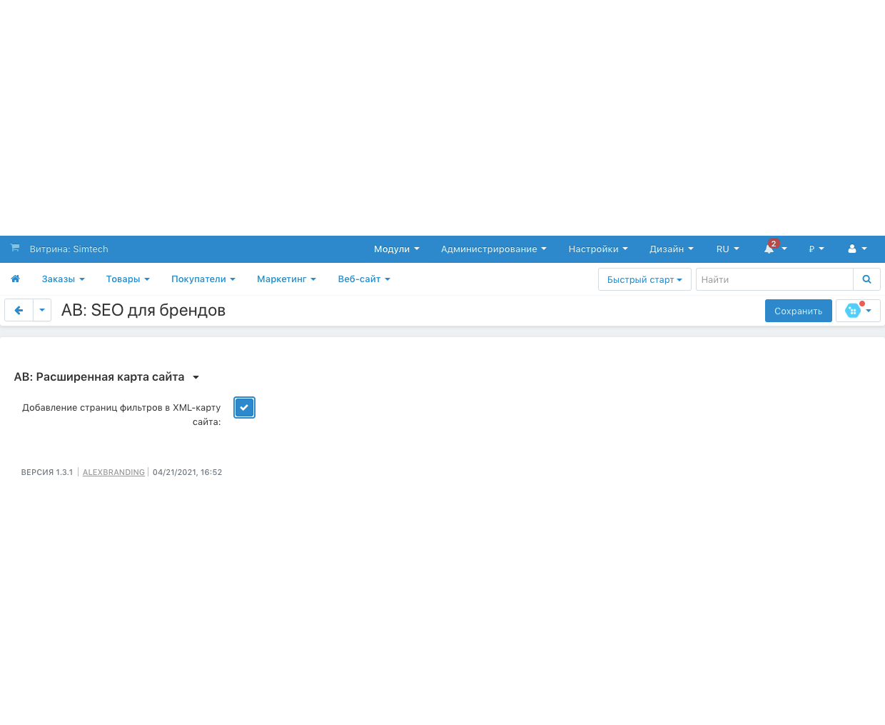 Благодаря интеграции с модулем AB: Расширенная карта сайта (при установленном модуле) в настройках модуля становится доступной новая настройка, которая позволяет добавлять в XML карту сайта ссылки на страницы списков вариантов характеристик с целью Бренд.