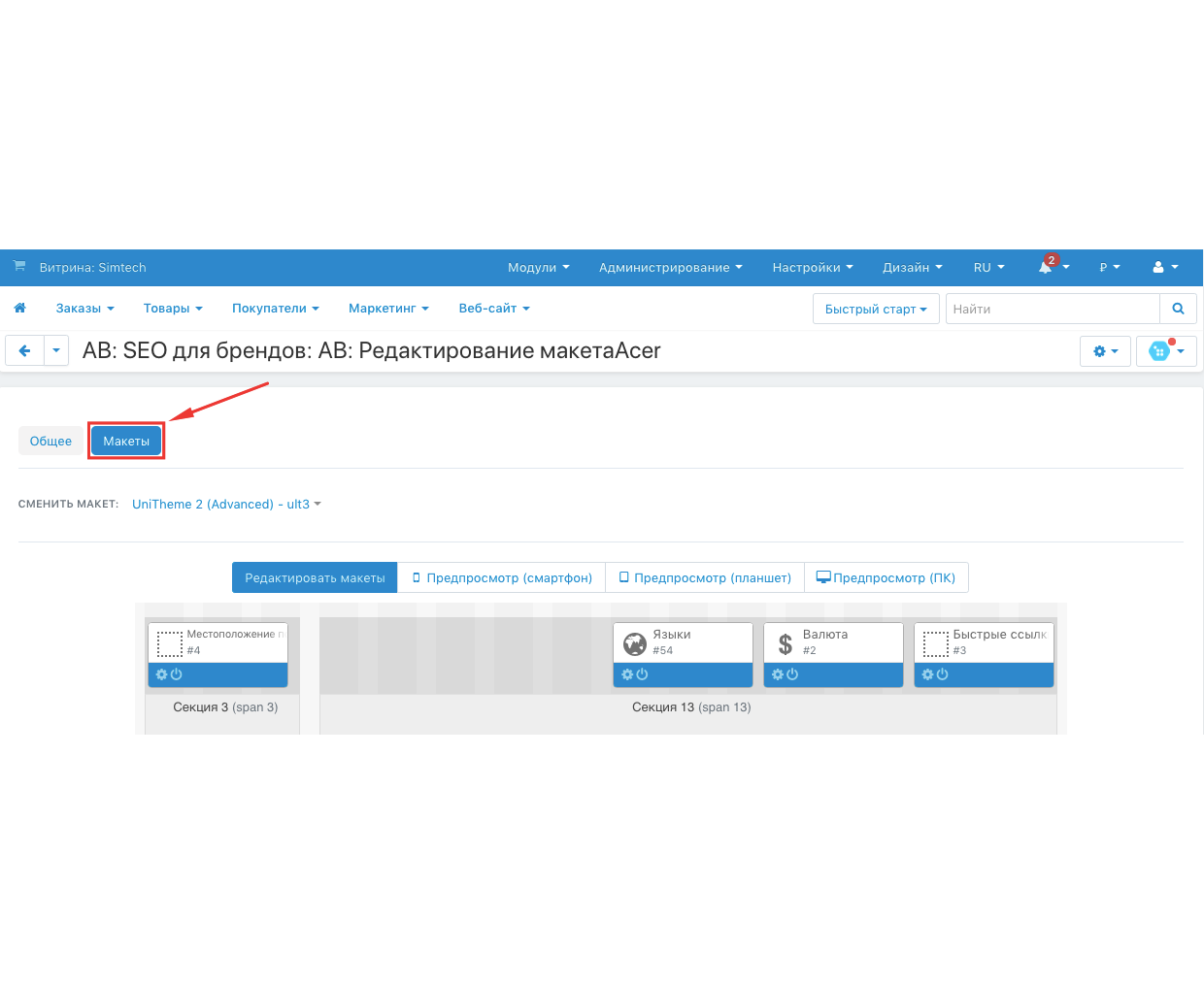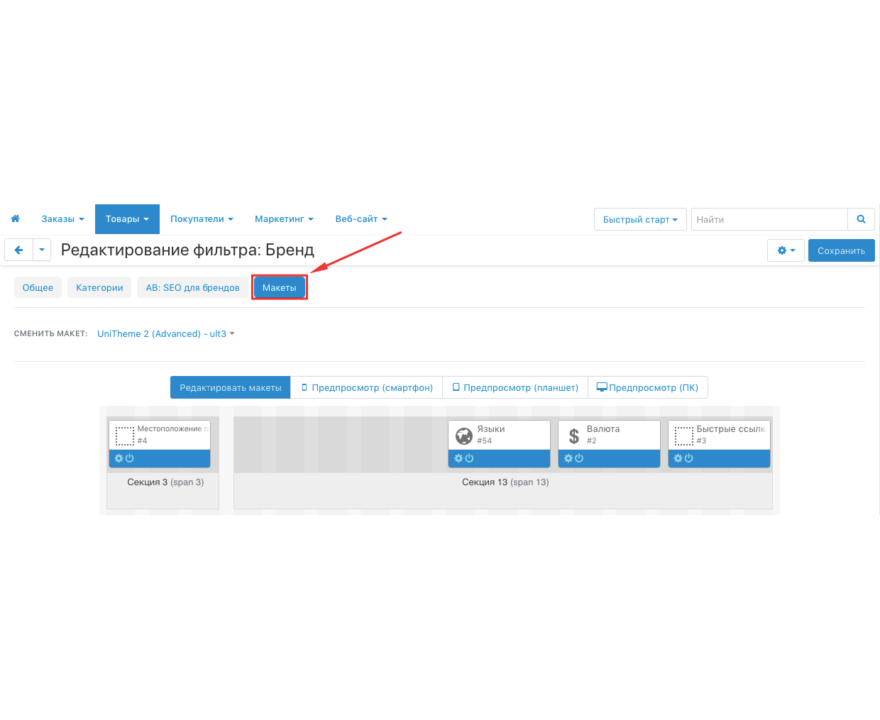 Модуль добавляет вкладку "Макеты" для редактирования страницы фильтра по характеристике с типом "Бренд". Администратор магазина может сконфигурировать макет страницы списка вариантов по такой характеристики, добавив отображение необходимых блоков.