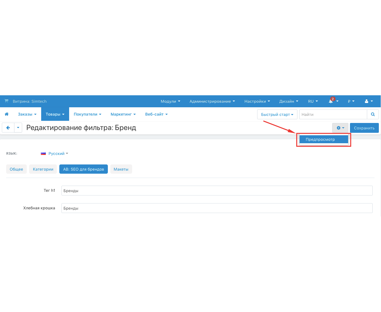 Модуль добавляет кнопку "Предпросмотр" для страницы редактирования фильтра по характеристике с типом "Бренд", что позволяет удобно отслеживать изменения после корректировок страницы.