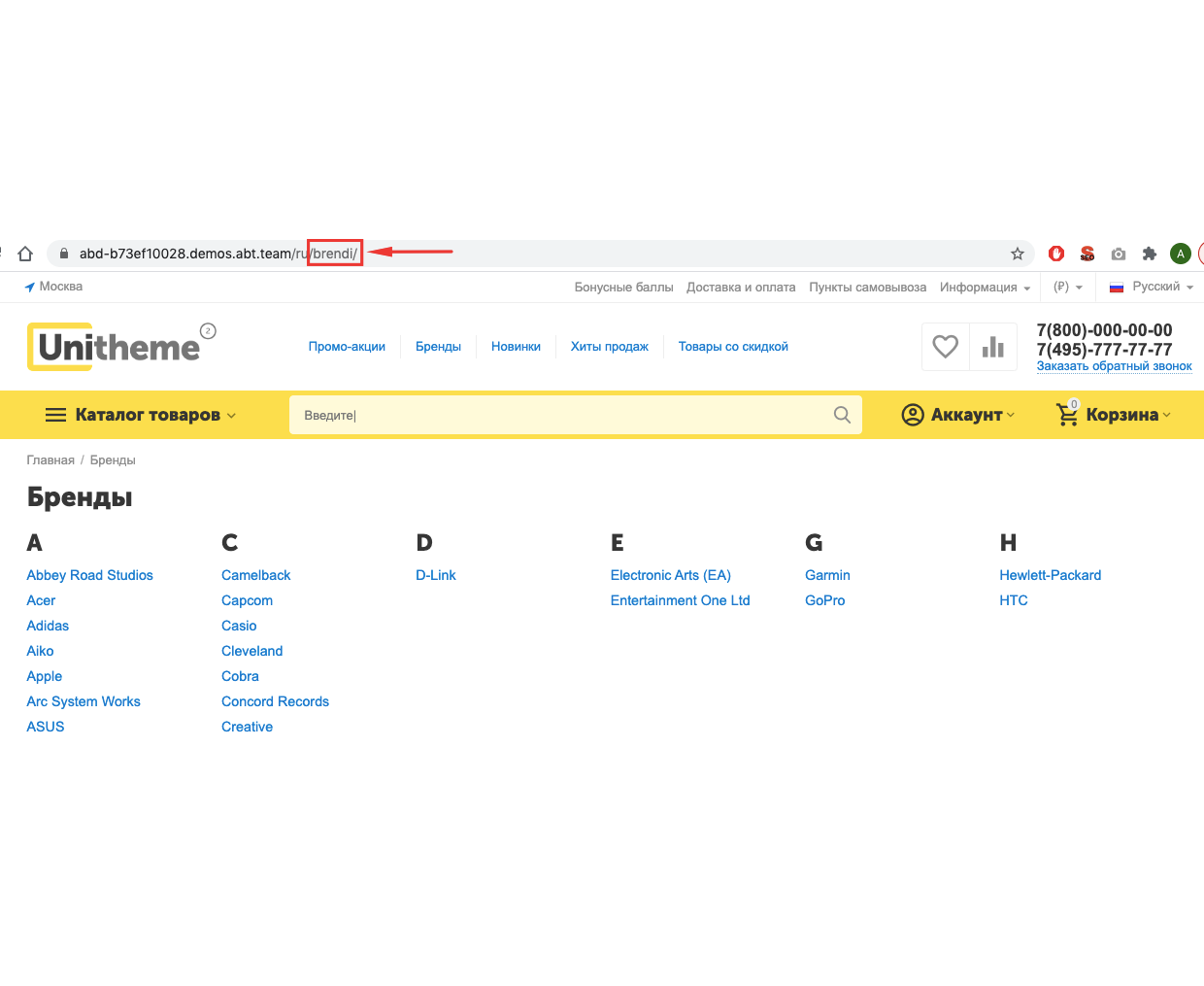 По умолчанию платформа CS-Cart для отображения списка брендов (авторов, коллекций и др) использует техническую страницу фильтра по соответствующей характеристике, например, для отображения списка брендов формируется такая страница: