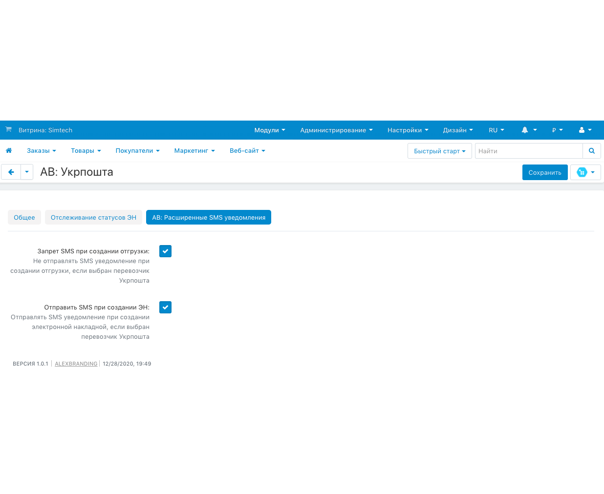 В этой вкладке настраивается SMS информирование заказчиков при создании отгрузок при выборе перевозчика Укрпошта. Данная возможность появляется в случае, если вы используете модуль Расширенные SMS уведомления из пакета модулей Украина)