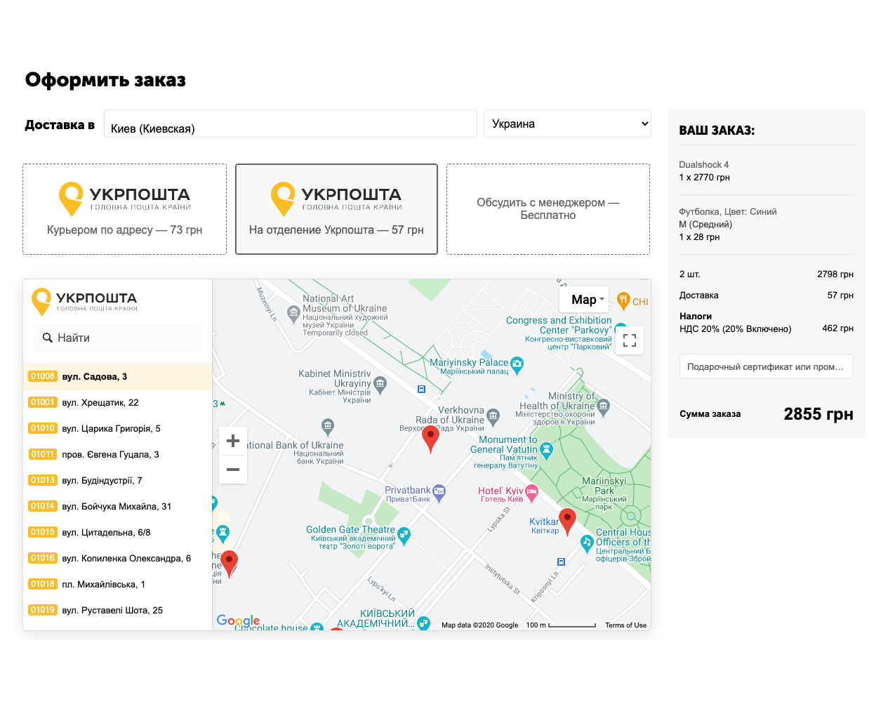 Для типа доставки "Склад - Склад" и "Двери - Склад" покупателю будет предложено выбрать отделение из доступных для города покупателя (а также выбранных в настройках способа доставки типов разрешенных отделений ). Для выбора отделения доступна карта отделений (модуль Карты и геолокация с выбранным и активированным сервисом от Google maps) а также быстрый поиск по улице, номеру дома и индексу отделения Укрпошты.