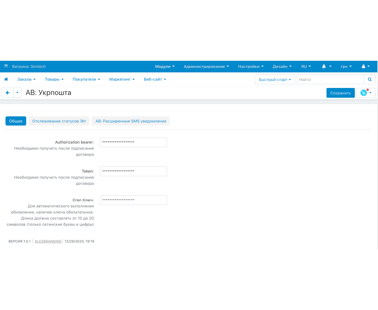 В настройках вам необходимо вставить ваши ключи API Укрпошта, полученные после заключения договора.