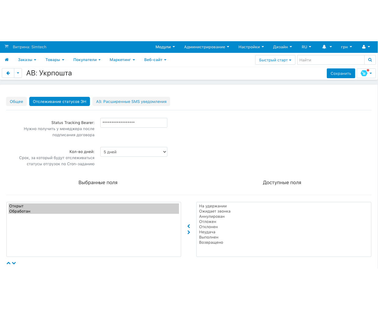 В этой вкладке настраивается отслеживание статусов заказов, что позволит обращаться по API Укрпошты и обновлять необходимые статусы заказов автоматически