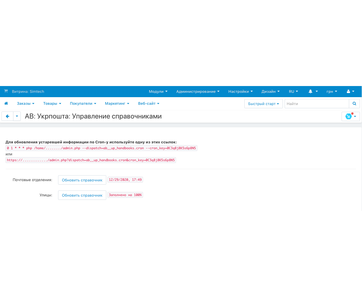 Далее после первичного наполнения базы (первое получение улиц из справочника Укрпошты может занять несколько часов) вы можете настроить автоматическую актуализацию отделений по CRON с необходимой периодичностью. Если в API Укрпошты появятся изменения, они автоматически отразятся в вашем интернет - магазине.