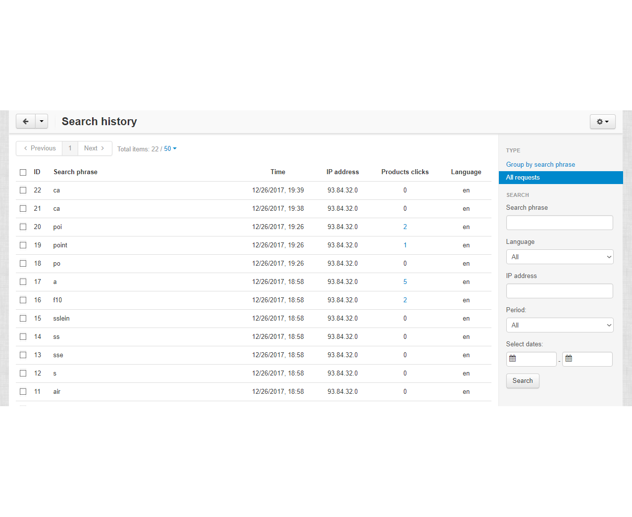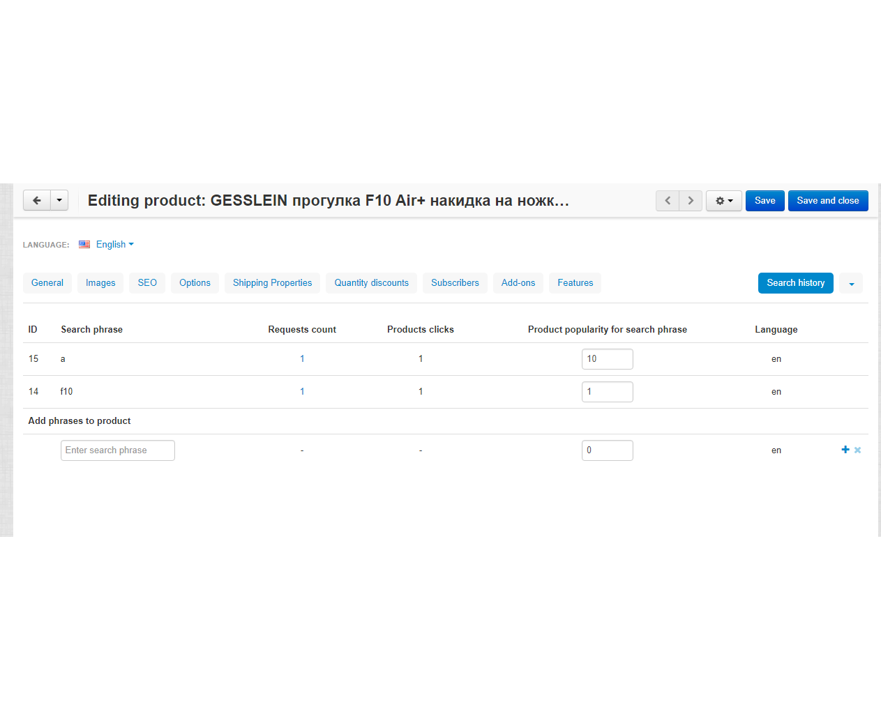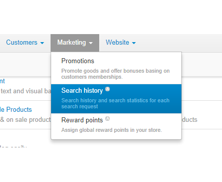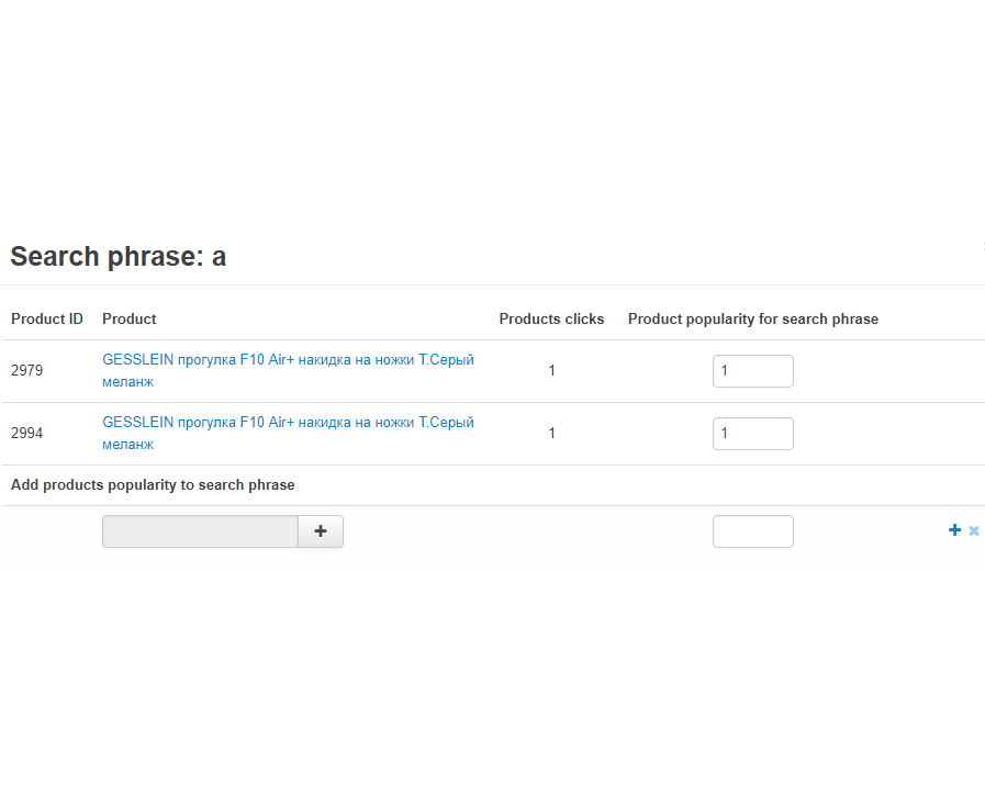 Вы можете вручную задавать популярность товарам и таким образом регулировать порядок выдачи товаров в списке для каждого поискового запроса, сделать это можно в карточке товара во вкладке История поиска. Общая статистика по истории поиска находится во вкладке Маркетинг/История поиска.